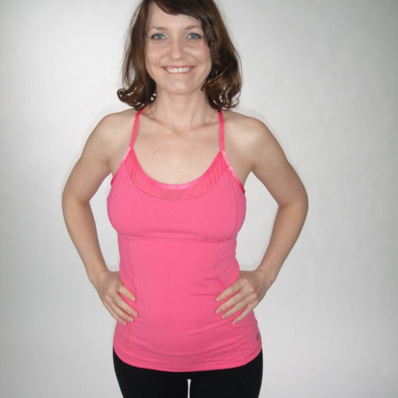 Clever seaming details along the bodice. Super pretty and flattering, fitted, longer body, perfect for yoga, gym, and wearing out in the summertime. Moisture-wicking fabric so you can glisten in style.